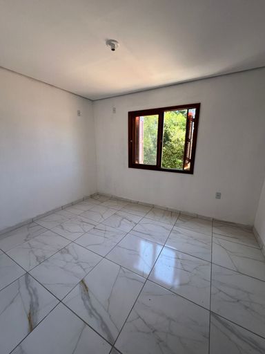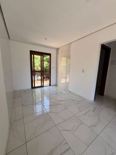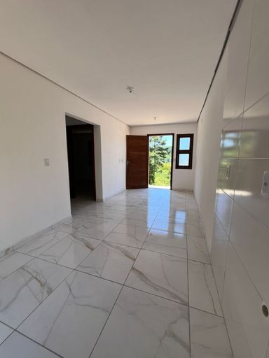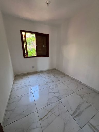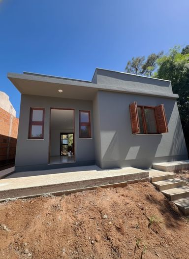 Casa com dois dormitórios, sala de estar/jantar, banheiro social, varanda na frente e nos fundos, terreno de 128m2.